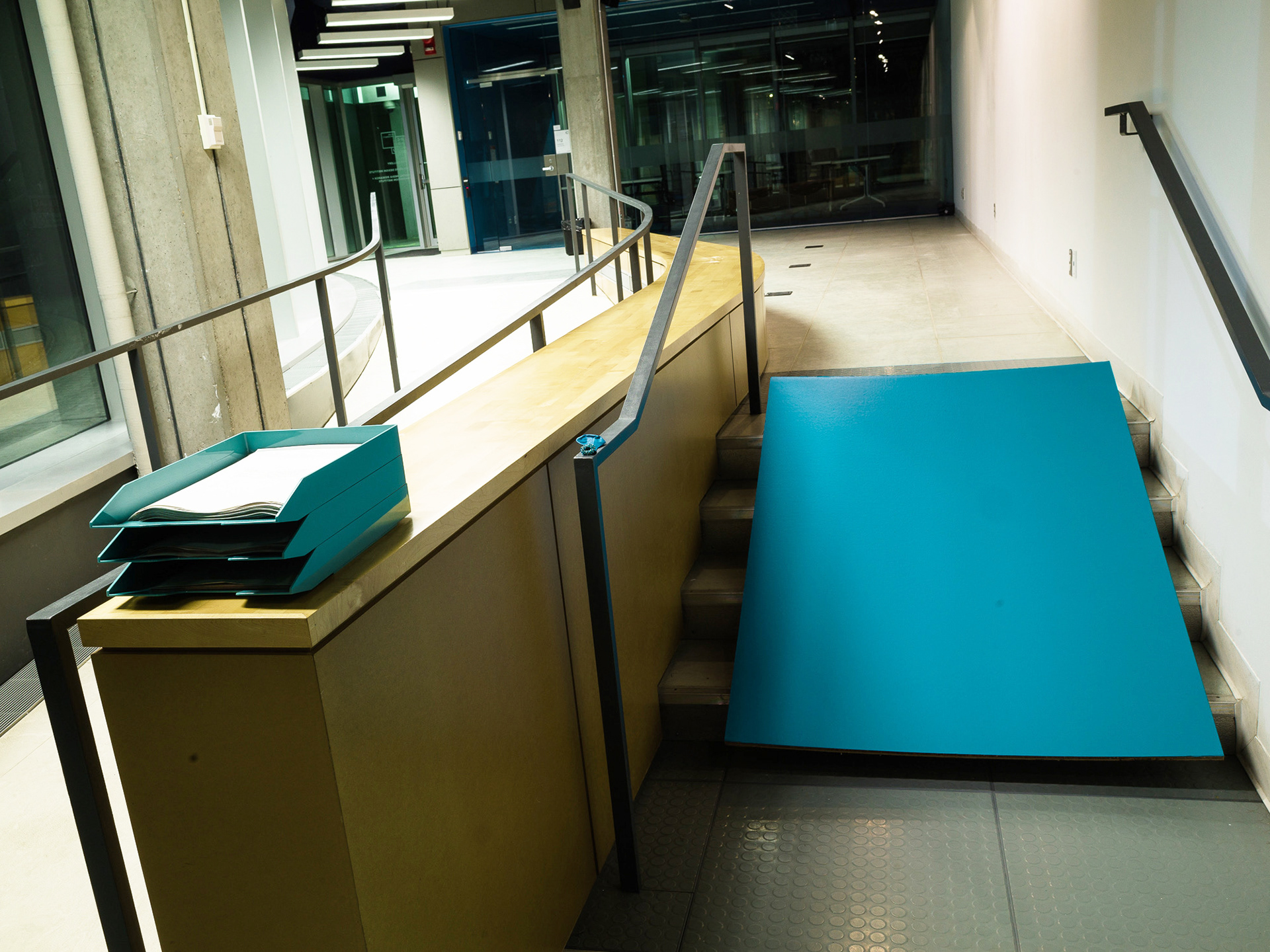 An intervention in the public exhibition space that reversed the usual situation, the stairs were made an inconvenient obstruction by converting them into an unusable ramp, requiring all users of the space to take the roundabout route of the accessibility ramp, making visible the often-overlooked inequities of public space.